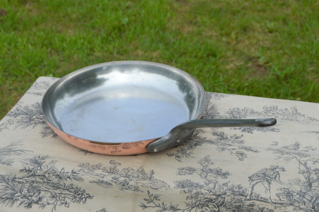 Poêle en cuivre – Ustensile en métal, à fond large, à bord évasé et à long manche, utilisé pour faire sauter, revenir, frire des aliments – Copper frying pan or skillet, metal utensil, wide, flared edge and long handle, used to saute, reheat or fry food. These can be used for flipping ingredients or frying eggs for instance in a shallow pool of oil, fat or shortening.