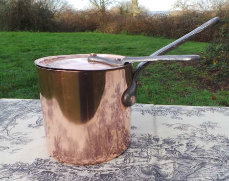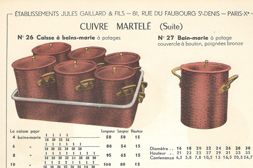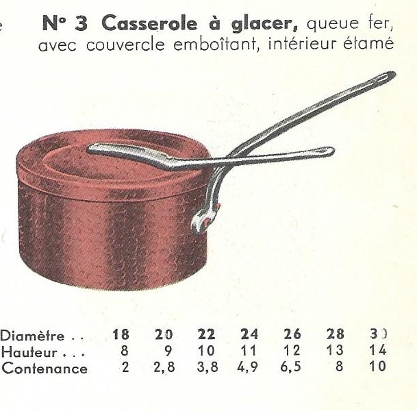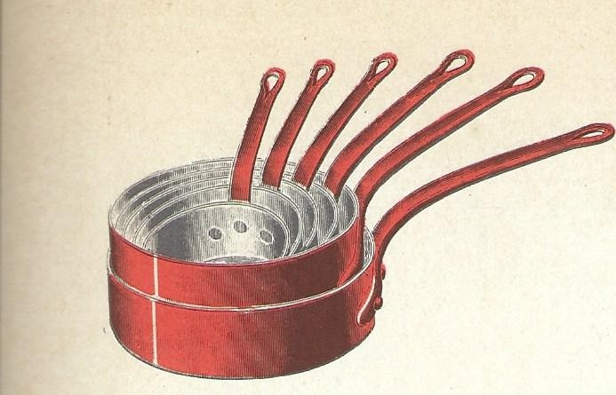 Everyday pans used by everyone for boiling vegetables, making sauces, generally easy to move and use. There are various versions of these types of casserole pans, the come in sets or singly, can be hammered – surface martelée, or flat, have different types of interiors, tin, silver, nickel, aluminium or stainless steel and different types of handles – poignées, queues or manche made from brass, bronze, aluminium, stainless steel, wood or iron. All are roughly the same style and can fit very well on a domestic stove as well as being very useful in a professional kitchen.