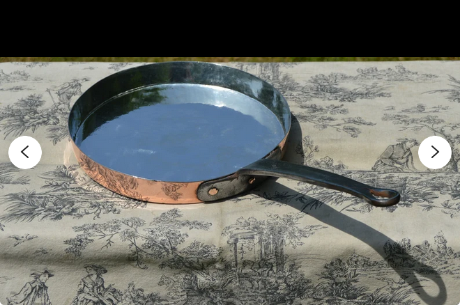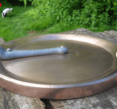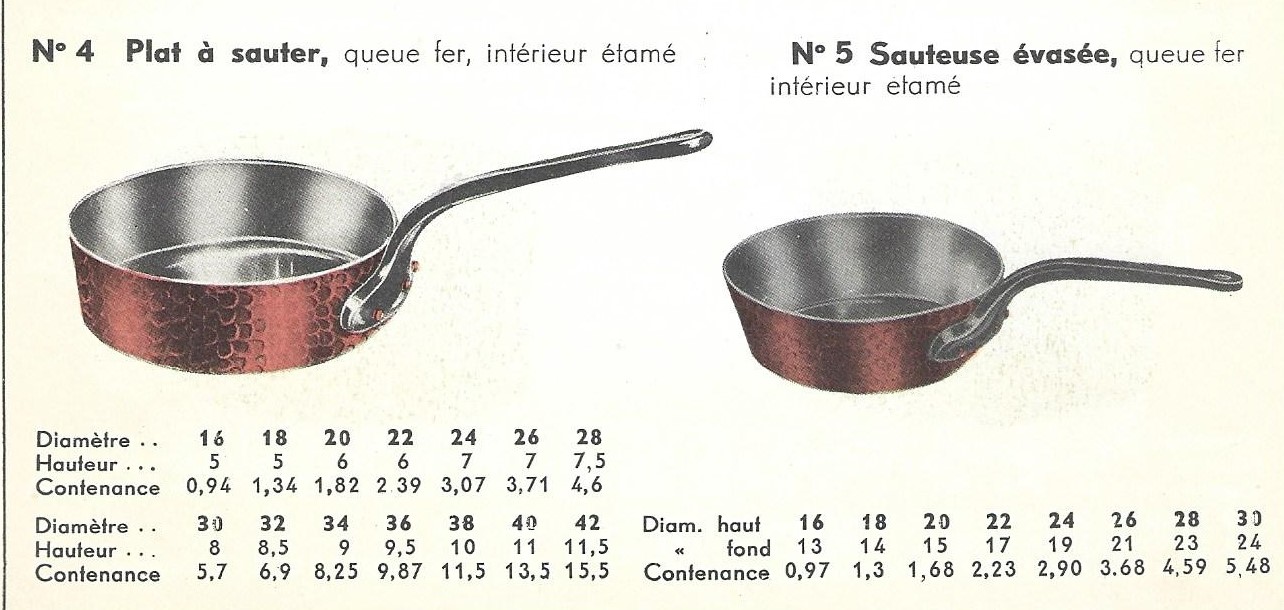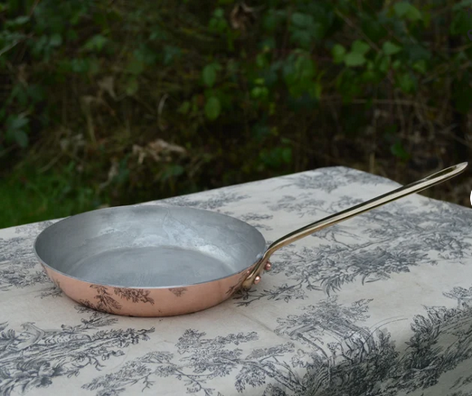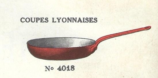 This frying pan is for easy flipping, it is lightweight and easy in the hand, it is made usually from 1-1.5mm copper. It can be tipped forward to make a pool of juices or fats and use a spoon to baste your meat or fish. The design is claimed to have originated from Lyon, the major culinary centre in the southern half of France.