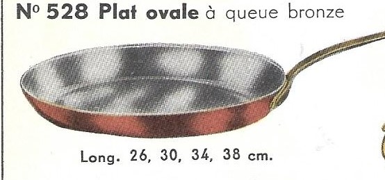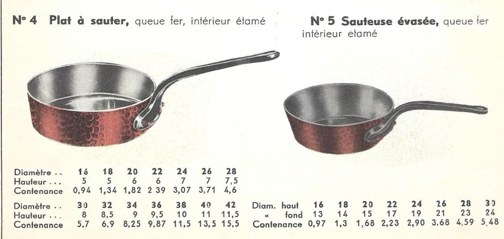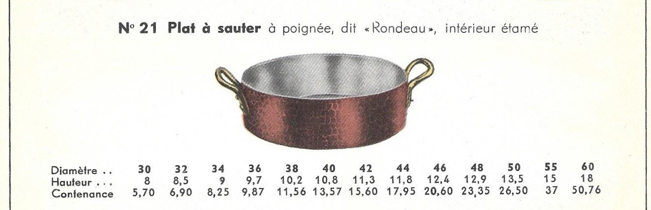 Plat à sauter deux poignées, dit ‘rondeau’ interieur etamé – Saute pan with two hand handles known as a ‘rondeau’ used for frying and sauteing foods but can also be used in the oven. This has fairly high sides as it can be used for browning meat – it has a large enough surface area to ensure that steam is allowed to escape but not the food! It also then can be used for prolonged cooking in an oven – lamb shanks for instance.
