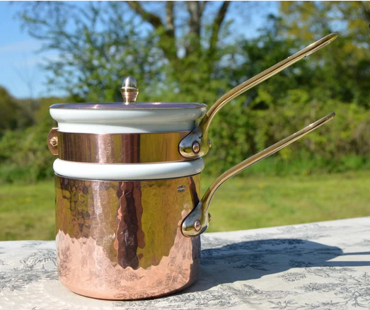 The bain-marie copper pan sits perfectly in the Mauviel pan, its little ears keeping the base off the surface of the pan – perfect poacher.